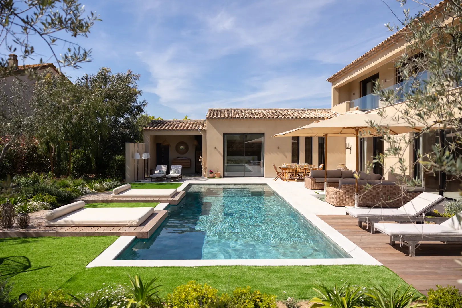Villa Santina is a sumptuous contemporary villa offering 250 m² of refined living space set within 1,300 m² of lush, wooded grounds. Ideal for holidays with family or friends, this prestigious villa with a private pool presents the perfect blend of luxury, comfort, and tranquility under the radiant Côte d’Azur sun. Featuring a generous 11 x 4.5-meter swimming pool surrounded by sun loungers, expansive terraces furnished with elegant garden furniture, and an outdoor dining area, Villa Santina invites you to enjoy a top-tier holiday filled with relaxation and sophistication.